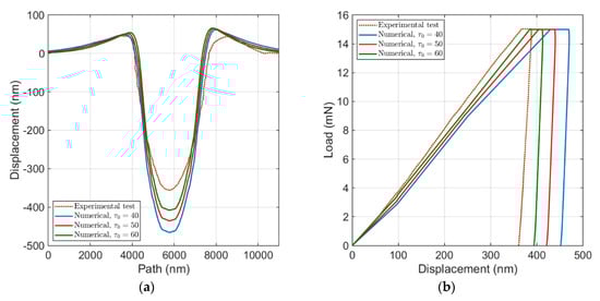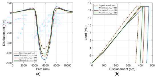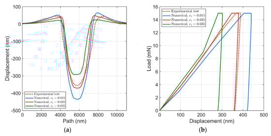 Figure 7a compares the surface topology of the developed numerical model by variation in , of which the most significant effect is on the penetration depth. By increasing and keeping the other parameters constant, the load–displacement curve shifts to the left side and tends to shift towards an agreement with the experimental test, as shown in Figure 7b. According to the described flow rule in Section 2.2, larger quantities of lead to a larger slip resistance and consequently to a reduction in plastic deformation. This effect becomes more visible by increase in , which results in smaller level of displacement in load–displacement curve and lower level of penetration depth in surface topology. It also leads to a small increase of the maximum pile-up height. However, comparing to a larger influence of on the penetration depth, its influence on the maximum pile-up height is negligible.
