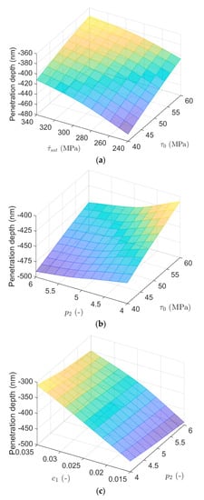 The influence of both and on the penetration depth is studied in Figure 1a. In the case of simultaneous contributions of these two parameters, the penetration depth increases as they both increase and the minimum of it occurs when these two parameters have the lowest quantities. On the other hand, the penetration depth for the lowest value of ( MPa) and the highest value of ( 340 MPa) is almost equal to the penetration depth for the highest value of ( MPa) and the lowest value of ( 240 MPa). Moreover, the penetration depth remains almost unchanged in the linear variation between the two combinations of extreme values ( MPa, 340 MPa) and ( MPa, 240 MPa).
