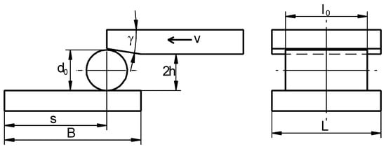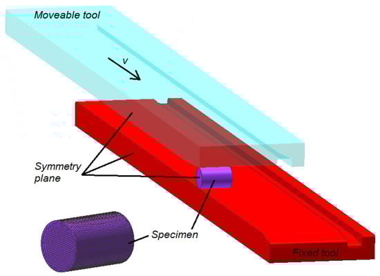 The geometrical model of the researched test, created in the aforementioned FEM program, is shown in Figure 5. The model comprises of two flat tools, one of which (the upper tool) moves in-plane motion with the speed v = 300 mm/s and a billet modeled with the use of eight-noded elements. In order to simplify the calculations, it was assumed that the tools act as perfectly rigid bodies and compression symmetry were used. The shape and dimensions of the tools and the billet were similar to the ones used in experimental testing.