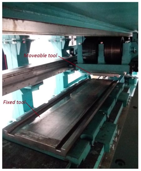 The rotational compression tests were performed in a laboratory stand for cross-rolling, located at the Lublin University of Technology. The rolling mill (SIGMA SA, Barak, Lublin, Poland) used in the tests was equipped with a hydraulic drive and allows for performing rolling processes using up to 1000 mm long tools. The working zone of the rolling mill with the tools allowing one to perform the rotational compression tests is shown in Figure 2.