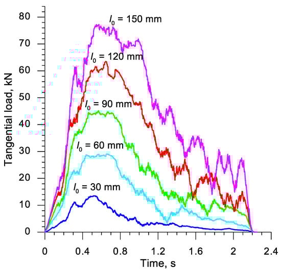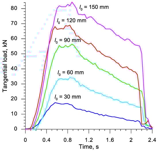 In the actual series of rotational compression tests, three samples of each length were formed. During the tests, the tangential force required to move the upper tool was observed. The measured forces, the distribution of which was presented in Figure 4, were later used for the verification of the developed numerical model of the rotational compression test.