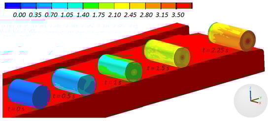 In total, five cases of compression were modeled, with the samples varying in length. An exemplary progression of the sample shape, prognosticated for one of the discussed cases of compression is shown in Figure 6. In all of the analyzed cases, the sample rolled relatively easily on the nether tool, as it was in the experimental tests.
