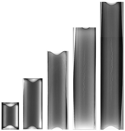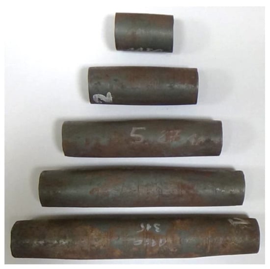Exemplary roentgenograms of the rotationally compressed samples; dimensions of the samples—diameter 30 mm, initial length (from the left) 30, 60, 90, 120 and 150 mm.