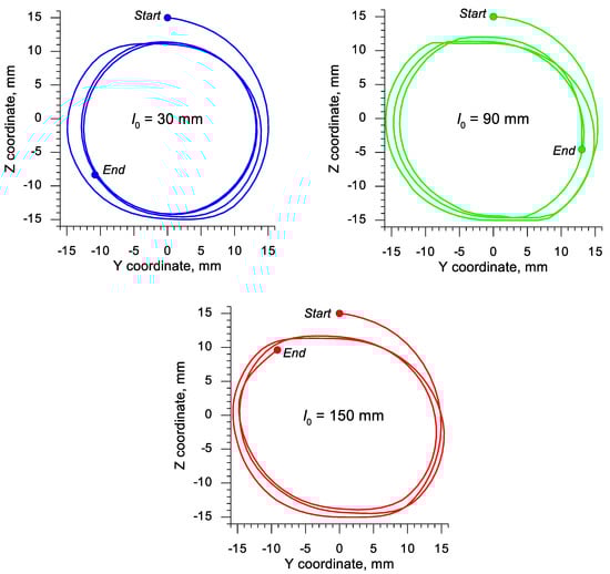 In order to clarify the ovalization of samples, trajectories of motion for the point located in the plane of symmetry and on the outer surface of the sample were determined. According to the results of experimental tests, the most significant ovalization of the cross-section occurred in this section of the sample. The obtained trajectories of this point in three samples with the length 30, 90 and 150 mm are shown in Figure 9. An analysis of the data presented in this figure indicates that a circular outline in the plane of symmetry was obtained only for the shortest sample.