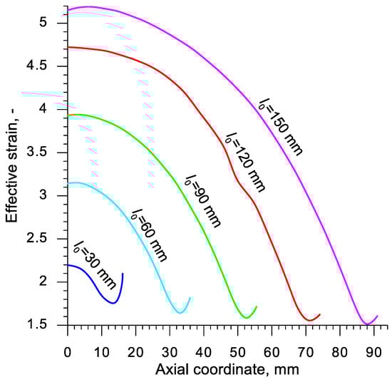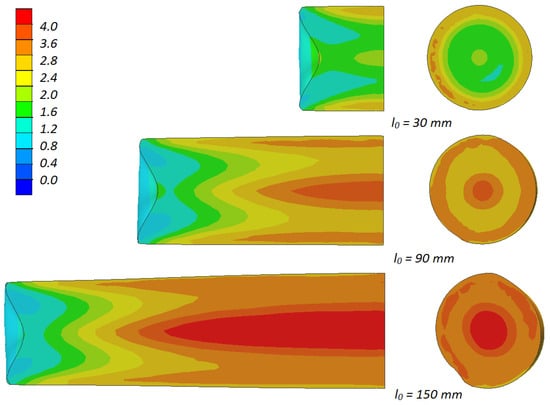A quantitative comparison of the values of strain occurring in the axial area of the samples is presented in Figure 11. The distribution of strain was similar in all the analyzed cases. The highest values of this parameter can be observed in the middle of the sample and decrease progressively nearing the front surface. An insignificant local increase in strain occurring in the end of the sample is connected to the change of the stress state, which is more similar to torsion at this point. It was stated that the increase of the sample length from 30 to 150 mm caused the effective strain to increase c.a. 135%.