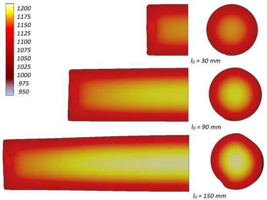 Quantitative distribution of the temperature in the samples, numerically calculated, is shown in Figure 13. The data in this chart indicates that the highest temperature occurs in the middle of the sample and increases along with the length of the billet. In the case of the longest samples, the numerically prognosticated increase of temperature exceeds 50 °C, whereas for the shortest samples it is equal c.a. 19 °C. The temperature decreases gradually towards the ends of the sample, which is a result of the decrease in the heat generated as a result of a change of plastic work. The temperature of the material in the front surfaces of the samples is insignificantly lower than the temperature of the billet. It is, however, to be kept in mind that the numerical simulation does not include the transfer of the samples from the furnace and placing them on the nether tool. The time of those actions was c.a. 10 s and indubitably caused the temperature within the real process to decrease.