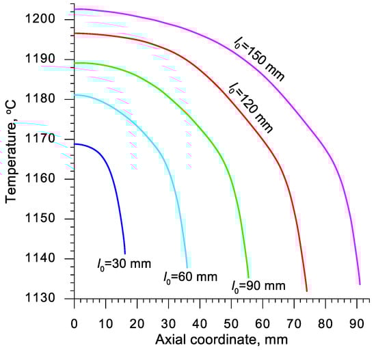 Distributions of temperature (w °C) in samples with the initial length l0, heated to T = 1150 °C and subjected to rotational compression in the path 315 mm; due to the symmetry of the process ½ samples was shown.