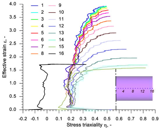 The dependency of effective strain on stress triaxiality in virtual sensors located in the axis of a sample with the length l0 = 90 mm, subjected to rotational compression.