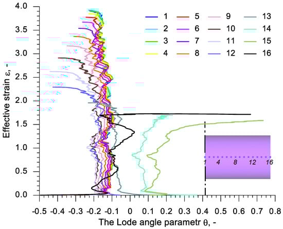 In order to analyze the state of stress in the discussed rotational compression test, 16 virtual sensors were located at every 3 mm in the axis of the sample with the length l0 = 90 mm. The first sensor was located in the plane of symmetry and the 16th sensor in the front surface of the sample. These sensors monitored the values of the stress state parameters, such as stress triaxiality η and Lode angle parameter θ. The change to those parameters during the rotational compression is shown in Figure 14 and Figure 15. An analysis of the data presented in those figures indicates that excluding the end sensors (14, 15 and 16) the deformation of the material has a similar character. The maximum values of the increase of deformation occur at the stress triaxiality equal c.a. 0.2. In the final phase of the rotational compression, however, this parameter increases rapidly—the more so, the less significant the ovalization of the cross-section. Similar conclusions can be drawn on the subject of the distribution of the Lode angle parameter, which is in the range −0.2 ÷ −0.1 in the phase of a significant increase of deformation (excluding sensors 14, 15 and 16).