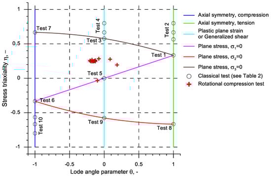 The values determined for the 16 aforementioned virtual sensors were used to obtain the points on the plane of stress state that represents the state of stress in the new rotational compression test (Figure 16). Moreover, on this plane, the calibration tests proposed by Wierzbicki et al., presented in Table 2, were marked. An analysis of the data from this chart indicates that that the stress state in the test differs from the ones from the tests performed thus far. The points representing the state of stress in the middle of the rotational compressed sample are located in area defined by the ordinates η (0.2; 0.3) and θ (−0.2; −0.1). This location differed significantly from the points representing the state of stress at the end of the sample.