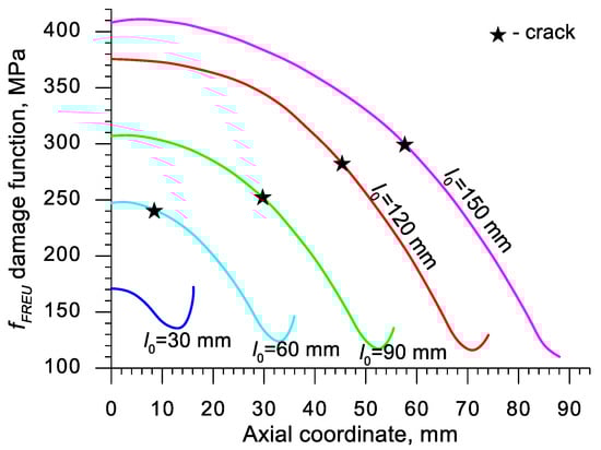 Distributions of the damage function in the axis of a rotationally compressed sample, determined with the use of the Freudenthal criterion.