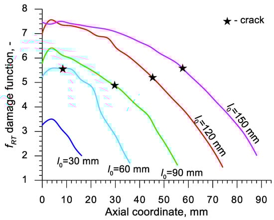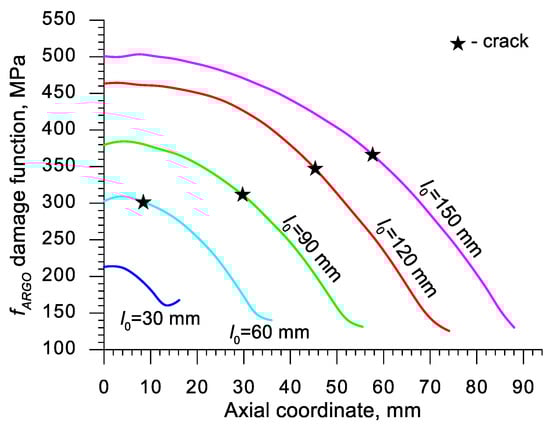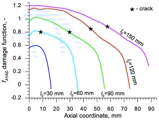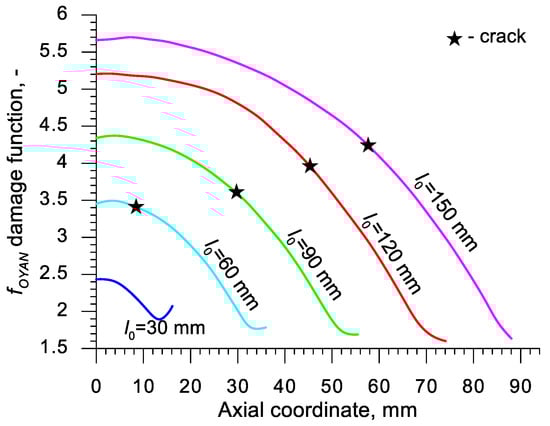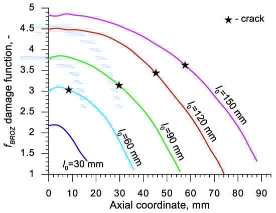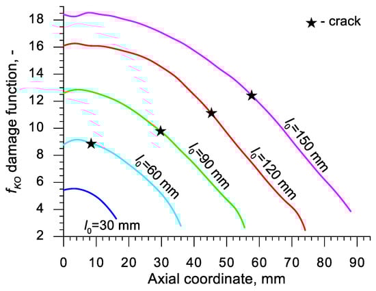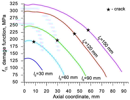 Using the results of the numerical simulations the distributions of the damage function fi in the axis of the formed samples, presented in Figure 18, Figure 19, Figure 20,Figure 21, Figure 22, Figure 23, Figure 24, Figure 25, Figure 26 and Figure 27 were done. It was stated that all of the distributions of the damage function progressed in a similar manner. The maximum values are reached in the middle of the sample (axial ordinate 0 expresses the location of the plane of symmetry) and decrease in the direction to its front. Moreover, a strong dependence on the value of the damage function from the initial length of the sample was observed. In all of the discussed cases, the increase of the length l0 caused a very significant increase in the damage function. order to determine the critical value of the damage function, Ci one ought to search the points (marked by ★) in which the cracking begins in the chart fi. The abscissae expressing the location of those points were determined based on the roentgenograms. The fi value in the point with the abscissa determined in such manner is equal to the searched critical value Ci.