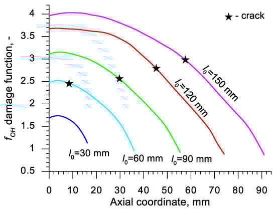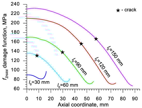Distributions of the damage function in the axis of a rotationally compressed sample, determined on the basis of the Zhan et al. criterion.
