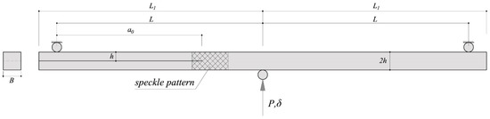 A non-contact optical system, ARAMIS 2D (GOM mbH, Braunschweig, Germany) [27], was coupled with the test device in order to measure crack tip opening displacements at the specimens during fracture tests. This technique applies the principles of digital image correlation (DIC) and makes possible full-field measurements, which lead to more robust results in comparison with conventional methods. ARAMIS 2D system is composed by an eight-bit charge-coupled device (CCD) camera with a telecentric lens, and two cold light sources to illuminate the specimens (Figure 2, left). Details of the DIC setting parameters are shown in Table 2. A subtle speckle pattern of black ink points on a white matte surface was applied at the crack tip area of every specimen using an airbrush IWATA, model CM-B (Anesta Iwata Iberica SL, Barcelona, Spain) in order to have proper granulometry contrast and isotropy at the magnification scale (Figure 2, right). Both the speckle pattern quality and the DIC setting parameters must be property selected to achieve a suitable compromise in terms of spatial resolution and accuracy [28,29,30]. In particular, a spatial resolution of 0.270 mm was decided in this work for a displacement accuracy around 1–2 × 10−2 pixel (0.18–0.36 μm2). The accuracy in displacements was estimated experimentally by statistically analysing noisy fields obtained by processing images recorded for rigid-body translation tests. P–δ data were recorded in all tests with an acquisition rate of 5 Hz. The DIC images acquisition was chosen as 1 Hz frequency. Crack tip opening displacements in Mode II (wII) were determined by post-processing the displacements monitored by DIC, as specified in Section 2.2.