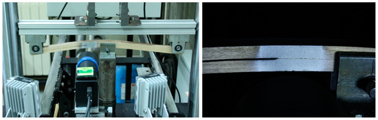 End-notched flexure (ENF) tests were proposed in this work. They consist of pre-cracked beam specimens which are loaded in a three-point bending configuration. Ten ENF specimens were cut from dried boards of E. globulus. The nominal dimensions were L1 mm × 2h mm × B mm (500 mm × 20 mm × 20 mm), as schematically shown in Figure 1. All specimens were oriented along the RL crack propagation system (Radial loading direction and Longitudinal crack propagation direction). A mid-height sharp pre-cracked surface of around 162 mm in length was initially performed by a band saw of 1 mm thickness and lengthened around 1–2 mm afterwards using an impacted blade. The actual value of initial crack length (a0) was more clearly measured after testing once the specimen was broken and thus divided in two parts.