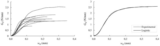 Experimental GII–wII curves (left); and experimental GII–wII curve of the ENF 144-1 specimen and fitting with the logistic function (right).