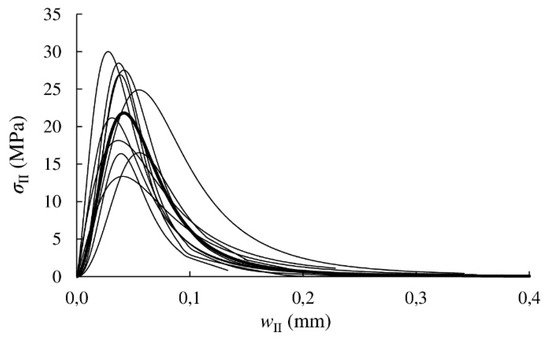 The cohesive laws in Mode II expressed by σII–wII relationship were obtained by analytical differentiation of the GII–wII curves. The results for each specimen are shown in Figure 9. The parameters describing the logistic function of every cohesive law (A1, A2, p and wII0 in Equation (9)), the area circumscribed by the cohesive laws (Glaw,II), the maximum stress (σIIu) and the relative displacements in Mode II corresponding to maximum stress (wIIu) are summarised in Table 4.