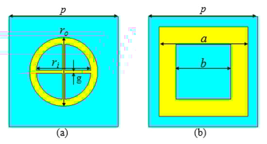The proposed AMC unit cells consist of two metal layers separated by a substrate with a thickness of 2.4 mm, a loss tangent of 0.025, and a dielectric constant of 4.3. Figure 1 depicts the structure of two AMC unit cells consisting of a rectangular and ring patch, the bottom one being a metallic ground that is printed on an FR-4 substrate.