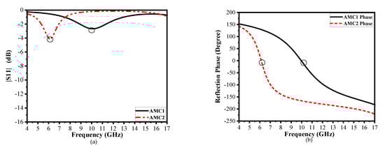 The metasurface unit cell design parameters are p = 8 mm, ro = 5 mm, ri = 3.99 mm, g = 0.20 mm, a = 6.5 mm, and b = 4 mm. Figure 2a illustrates the |S11| of both AMC unit cells, which have different resonant frequencies to obtain a wideband effective phase difference. The resonant frequencies of AMC1 and AMC2 are 10.1 GHz and 6.13 GHz, respectively. However, the reflection magnitude is higher because of the use of lossy-substrate (FR-4) to obtain a lower frequency resonant of the AMCs unit cells with an effective phase difference (so that there is little absorption of the energy); is shown in Figure 2a. The patch size primarily governs the reflective phase of these fundamental unit cells in a certain frequency band. Analysis and optimization of the parameters to achieve the reflection phase difference around 180° between two units cells in the broadband frequency range have been carried out by means of CST Microwave Studio software. Unit cell boundaries and floquet ports are used in CST Microwave Studio to create infinite periodic array simulations.
