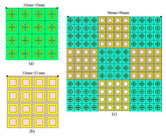 AMC unit cell arrangements in two different chessboards. (a) 4 × 4 tiles are arranged with AMC1 unit cell, and the block array size is 32 mm × 32 mm. (b) 4 × 4 tiles are arranged with AMC2 unit cell, and the block array size is 32 mm × 32 mm. (c) Two AMC unit cells are arranged like a chessboard, an array block size of 96 mm × 96 mm.
