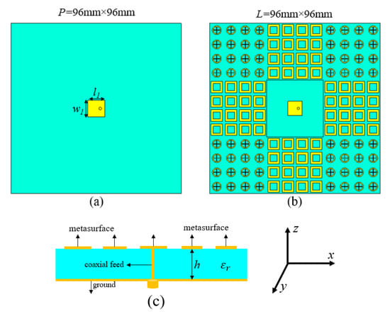 Structure and configuration of reference and proposed antennas. (a) The front outlook of the reference antenna. (b) The front outlook of the proposed metasurface chessboard with the antenna. (c) General configuration of the proposed prototype.