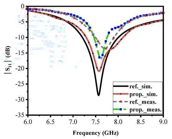 Due to the small influence of AMC patches, the resonance frequency of the proposed antenna is shifted to a lower frequency. Furthermore, the simulated and measured |S11| is given for the reference and proposed antenna at 7.6 GHz and 7.57 GHz, respectively—this is shown in Figure 5.