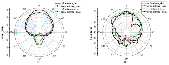 Measured and simulated results of radiation pattern of reference and proposed antenna at 7.6 GHz. (a) Measured and simulated radiation patterns in the xoz plane. (b) Simulated and measured results of the radiations pattern in the yoz plane.