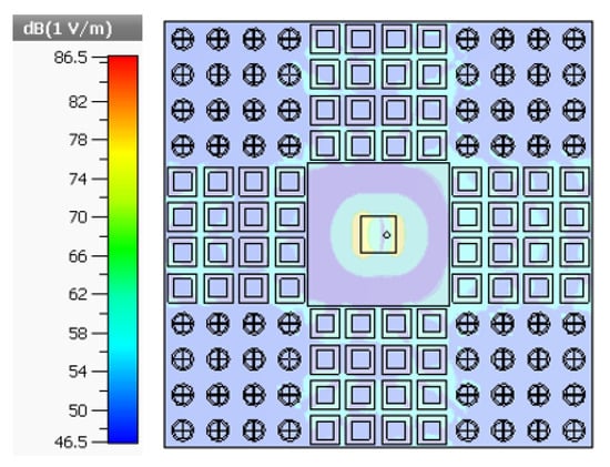 E-field distribution of maximum in-band radar cross-section (RCS) reduction at 7.6 GHz.