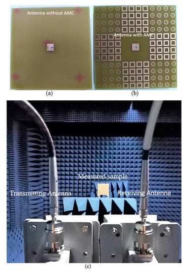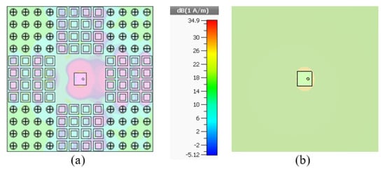 The proposed configuration for the patch antenna is revealed in Figure 4. The proposed pattern consists of a 3 × 3 array block that is mounted around the patch antenna. The microstrip antenna and AMC unit cells are printed on the FR-4 slab, with dielectric constant and loss tangent 4.3 and 0.025, respectively. The new antenna has a patch size of w1 = 8 mm, l1 = 8 mm, and a total dimension of 96 mm × 96 mm. Besides, a conventional antenna is chosen as the reference antenna with PEC, as shown in Figure 4a.