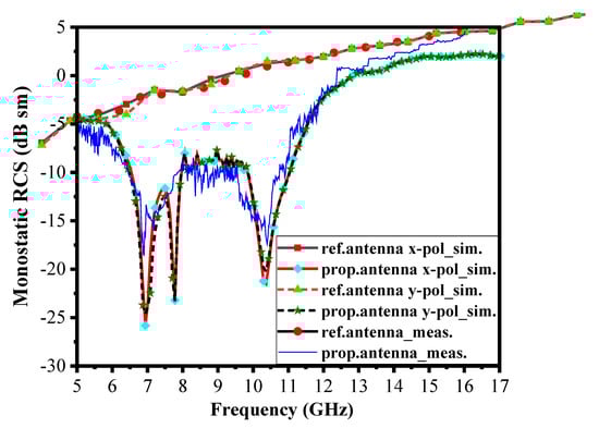 Simulations and measurements of the monostatic backscattering of the reference and proposed antenna.