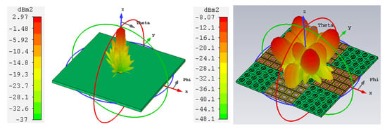 where P represents the pattern of the elements, array factor is the FA, and wavenumber is denoted by k, ϕ (m, n) is the phase of (m, n), and ∆x and ∆y are the space concerning the adjacent components along x– and –y directions, respectively. Elevation and azimuth angles of an incidence are the θ and ϕ, respectively. Nevertheless, the 180° phase difference cannot be sustained over a wideband as the reflection phase varies with frequency. Typically, a reduction of 10 dB backscattering is set as a requirement for comparison with PEC or antenna of the same length in Equation (3), that is,
