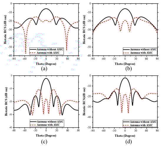 The bistatic RCS was efficiently reduced due to the principle of phase cancellation of coding AMC. In Figure 11a bistatic backscattered energy of the proposed prototype was reduced in the angular plane, the backscattering in the xoz plane −69° ≤ θ ≤ ±38°, −21° ≤ θ ≤ +21°, and (b) in the yoz plane, −90° ≤ θ ≤ −37°, −22° ≤ θ ≤ +22° and +37° ≤ θ ≤ +90°. Furthermore, (c) in the xoz plane, −15° ≤ θ ≤ +15° and (d) in the yoz plane, −16.4° ≤ θ ≤16.6°. Bistatic backscattered energy was considerably reduced between these angles.