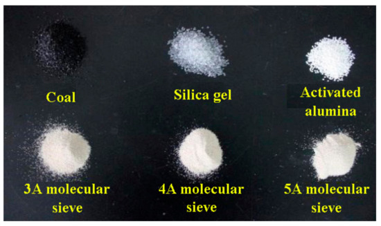 Testing materials selected in the experiment: coal, silica gel, activated alumina, the 3Å molecular sieve, 4Å molecular sieve and 5Å molecular sieve.