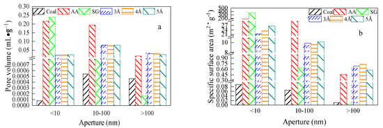 B.B. Hoodot [32] divided the pores in coal into micropores (<10 nm), transition pores (10–100 nm), mesopores (100–1000 nm) and macropores (>1 μm). The pore volume of the nanoscale pores (0–100 nm) determines the adsorption rate of coal, and the specific surface area of the nanoscale pores determines the ultimate adsorption of coal [33]. Moreover, the macroporous adsorption effect of diameter greater than 1 μm is not obvious; therefore, only micropores, transition pores and mesopores are considered in this test.