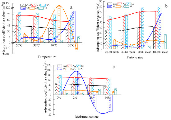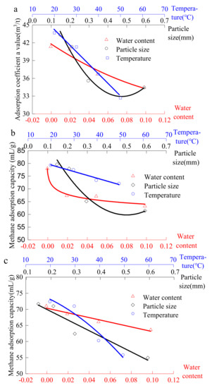 It can be seen from Figure 10a that hydrogen bonds can be formed with water molecules due to the existence of many polar dangling bonds on the coal surface. Then, because of the intermolecular force, the coal sample has strong water absorption, and the adsorbed water will occupy the pores of some coal. Therefore, with the increase of moisture content, the methane adsorption capacity of the #1890 working face coal sample in Aiweiergou gradually decreases. Since the decrease of the particle size increases the specific surface area of the coal [37], the increased specific surface area provides more adsorption sites for methane adsorption, so the methane adsorption amount increases as the particle size decreases. Since coal adsorption methane is an exothermic process [38,39], the increase in temperature inhibits the adsorption of methane by coal, so the amount of adsorption decreases. The value of the adsorption coefficient a decreases parabolically with the change of moisture content and particle size, and decreases linearly with the increase of temperature.