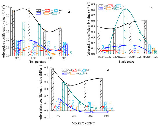 The adsorption coefficient b value varied based on temperatures, particle sizes and moisture contents. Under the effect of the three factors, it is found that the adsorption coefficient b values of the #1890 working face coal sample in Aiweiergou are between 0.3 MPa−1 and 0.61 MPa−1, the adsorption coefficient b values of activated alumina are between 0.057 MPa−1 and 0.066 MPa−1, and the adsorption coefficient b values of silica gel are between 0.114 MPa−1 and 0.194 MPa−1. The coefficient b values of the coal sample are large as shown in Figure 4a–c. In Figure 4a, the designed particle size was 60–80 mesh, the moisture content was 0%. The coefficient b values of activated alumina and silica gel consistent with the change law of coal sample. The coefficient b values of the coal sample, activated alumina and silica gel have no significant change in Figure 4b, the designed temperature was 30 °C and the moisture content was 0%. In Figure 4c, the designed temperature was 30 °C and the particle size was 60–80 mesh. In addition, the coefficient b values of the 3Å molecular sieve showed negative values twice. Obviously, the adsorption coefficient b value is highly dependent on the three factors.