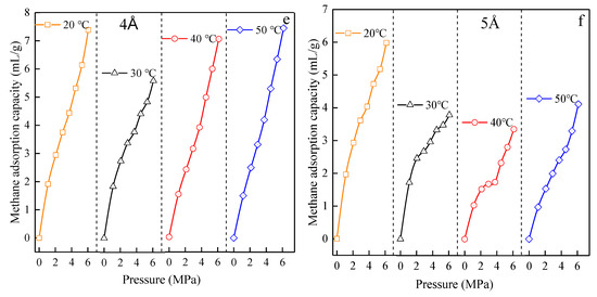 The methane adsorption capacities of the #1890 coal sample, activated alumina, silica gel, 3Å molecular sieve, 4Å molecular sieve and 5Å molecular sieve in the #60–#80 sieves particle size were obtained using the experimental design moisture contents, constant temperature 30 °C, and different design pressure conditions. The measurement was carried out by the WY-98A. The methane adsorption capacity for each material are shown in Figure 7.