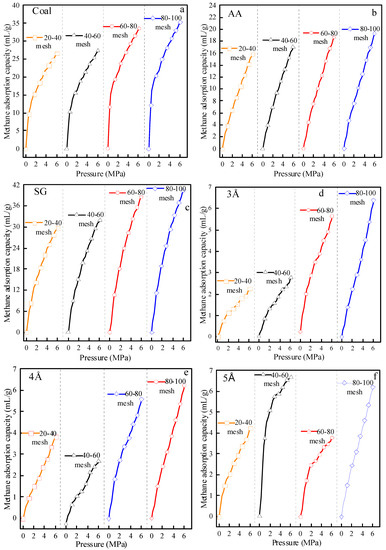 It can be seen from Figure 6 that the methane adsorption capacities of the five testing materials are similar with the ones shown in Figure 5. The methane adsorption isotherms of the coal samples collected from the #1890 working face in Aiweiergou, and the methane adsorption capacity of the activated alumina and silica gels, increased as the pressure increases. However, the adsorption isotherms of coal-like materials sampled from 3Å molecular sieves, 4Å molecular sieves and 5Å molecular sieves showed different trends as compared to the previous three material samples. The findings provide the fact that the characteristics of the coal-like materials collected from 3Å molecular sieves, 4Å molecular sieves and 5Å molecular sieves exhibit different mechanical behavior. Specifically, when the size of the 3Å molecular sieve was retained between #20–#40 sieves, #40–#60 sieves and #60–#80 sieves, the 4Å molecular sieve at #60–#80 sieves, and the 5Å molecular sieve at #40–#60 sieves and #60–#80 sieves, the methane adsorption capacity of the three kinds of molecular sieve after 4 MPa changes slightly, considering that the whole adsorption process is in line with the rising trend of "steep-slow". The methane adsorption capacity value of the three kinds of molecular sieve was different under different particle sizes, and has no important pattern.