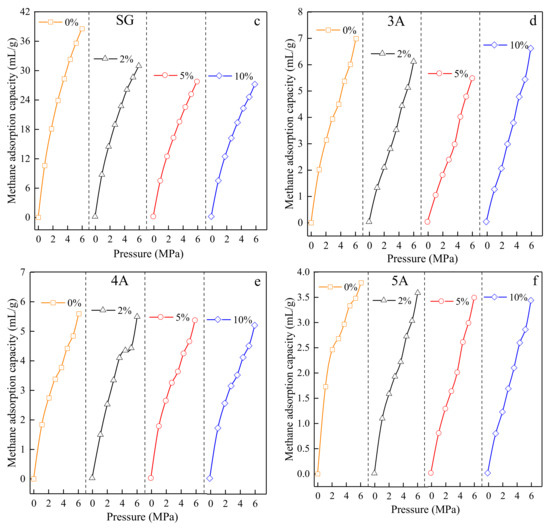It can be seen from Figure 7 that the effect of the moisture content of coal materials in the adsorption isotherm of the methane adsorption is significant for the samples collected from the Aiweiergou #1890 working activated alumina and silica gel. The adsorption isotherms of 3Å molecular sieves, 4Å molecular sieves and 5Å molecular sieves at different moisture contents fluctuated differently among these three materials. It can be seen that when the moisture content of the 3Å molecular sieve is at 0%, the moisture contents of 4Å molecular sieve are at 0%, 5% and 10%, and the moisture contents of the 5Å molecular sieve are at 0%, 2% and 5%, the amount of adsorption of the three molecular sieves tend to be is less after 4 MPa. In addition, there was no significant change in the adsorption capacity of each molecular sieve under different pressures.
