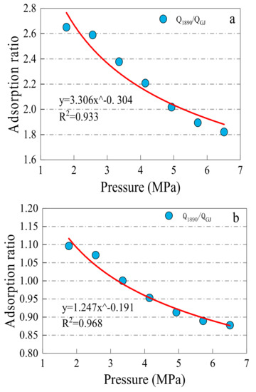 Methane adsorption ratio between adsorption materials and #1890 coal samples in pressure point: (a) Q1890/ QAA; (b) Q1890/ QSG. Note: Q1890, QAA, and QSG indicate the methane adsorption capacity of the #1890 working face coal sample of Aiweiergou, the activated alumina and silica gel, respectively.