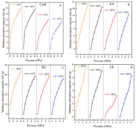 The methane adsorption capacities of the #1890 coal sample, activated alumina, silica gel, 3Å molecular sieve, 4Å molecular sieve and 5Å molecular sieve in the #60–#80 sieves particle size were obtained using the experimental design moisture contents, constant temperature 30 °C, and different design pressure conditions. The measurement was carried out by the WY-98A. The methane adsorption capacity for each material are shown in Figure 7.