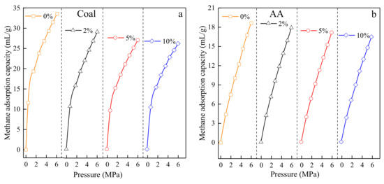 It can be seen from Figure 7 that the effect of the moisture content of coal materials in the adsorption isotherm of the methane adsorption is significant for the samples collected from the Aiweiergou #1890 working activated alumina and silica gel. The adsorption isotherms of 3Å molecular sieves, 4Å molecular sieves and 5Å molecular sieves at different moisture contents fluctuated differently among these three materials. It can be seen that when the moisture content of the 3Å molecular sieve is at 0%, the moisture contents of 4Å molecular sieve are at 0%, 5% and 10%, and the moisture contents of the 5Å molecular sieve are at 0%, 2% and 5%, the amount of adsorption of the three molecular sieves tend to be is less after 4 MPa. In addition, there was no significant change in the adsorption capacity of each molecular sieve under different pressures.