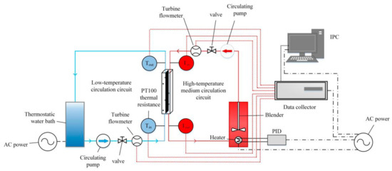 Figure 1 shows the schematic of the experimental setup, where the solid line is the flow channel and the dotted line is the connection line of the data acquisition system. The experimental setup consisted of a low-temperature medium circulation circuit, a high-temperature medium circulation circuit, an experimental section, and a data acquisition system. During the experiment, the high temperature work fluid and low temperature work fluid exchanged heat in the experimental section via circulating pumps and flow meters, and their inlet and outlet temperatures were recorded through the data acquisition system.