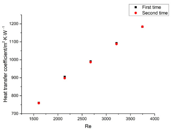 In order to verify the stability of the experimental setup, repeatability experiments were conducted. The experiments were performed by taking distilled water as the circulating working fluid, high temperature working fluid at 65 °C, and 0.35 m/s and low temperature working fluid at 30 °C, increasing the flow velocity of the low temperature working fluid from 0.15 m/s to 0.35 m/s. The overall heat transfer coefficients for the repeatability experiments are shown in Figure 2. Under the conditions of changing the flow velocity, the maximum difference in the heat transfer coefficient of the two experiments was lower than 1%, which verifies the stability of the experimental setup.