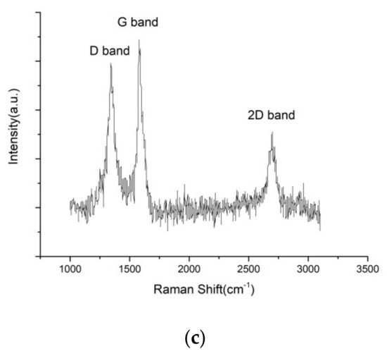 The Ni-P-rGO coating material was prepared on Q235 carbon steel (500 mm × 50 mm × 0.5 mm) via electroless plating. Before electroless plating, the substrates were first polished with an 800-grit waterproof abrasive paper and a 600-grit waterproof abrasive paper to make the surface smooth and flat, respectively. The oil was then removed using alkali washing and the rust was removed using 20% sulfuric acid for 1 min. Finally, the substrates were placed into 10% sulfuric acid for 1 min to activate the surface. After each step, the carbon steel surface was cleaned with distilled water. Table 1 lists the electroless bath formulation composition and operating conditions. The pH of the electroless bath solution was adjusted to 4.8 by adding ammonium hydroxide. The electroless plating process lasted 120 min. As shown in Figure 3, after successful plating, the coating was analyzed via scanning electron microscope and Raman spectroscopy. Figure 3a,b displays the morphology of carbon steel and Ni-P-rGO coating under a scanning electron microscope. The surface of the carbon steel was uneven and had several scratches and the Ni-P-rGO coating showed greater flatness than carbon steel in the microstructure. However, there were several inlaid nodules in the Ni-P-rGO coating, confirming the presence of graphene with a high specific surface area to stimulate the nucleation [13]. Figure 3c shows the Raman spectrum of the Ni-P-rGO coating. There were three evident peaks at 1350 cm−1, 1580 cm−1, and 2700 cm−1, which correspond to the D band, G band, and 2D band. The D band is assigned to the breathing mode of the ĸ-point phonons with A1g symmetry [16] and it associates with the edge defects of graphene. The G band introduces the E2g phonon of the carbon sp2 atoms, which is due to the highly ordered graphite [17]. The 2D band was generated by double phonon double resonance, which is closely related to the band structure of graphene [18].