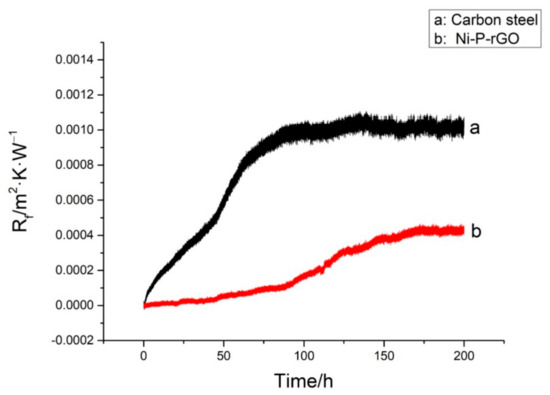- Compared to the carbon steel, which was used to prepare the heat exchange device as raw materials, the advanced materials with Ni-P-rGO coating had an important property that inhibited biofouling. They not only reduced the asymptotic value of the fouling resistance of iron bacteria fouling significantly, but also greatly increased the induction period and fouling growth time.