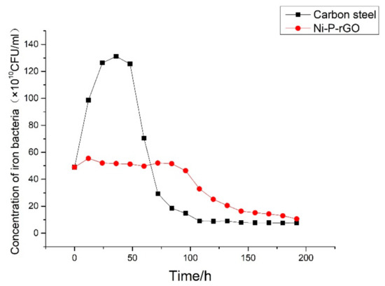 The experiments of carbon steel and Ni-P-rGO coating were performed when the conditions were with a low temperature working fluid at 30 °C, flow velocity at 0.25 m/s, and initial concentration of iron bacteria at 48.91 × 1010 CFU/mL, and with the high temperature working fluid at 65 °C, the flow velocity was at 0.35 m/s. The results are shown in Figure 4. As shown in the figure, the asymptotic value of the fouling resistance of Ni-P-rGO coating was much smaller than the carbon steel. Moreover, the fouling resistance of carbon steel increased rapidly as compared with the Ni-P-rGO coating. There was no induction period on carbon steel and it only took 90 h to reach the asymptotic value of fouling resistance. However, the Ni-P-rGO coating had an induction period of about 40 h, and the rate of fouling growth was extremely slow and took 175 h to reach the asymptotic value of fouling thermal resistance. This period of time was almost twice as long as the carbon steel. The changes in the concentration of iron bacteria during the experiment are shown in Figure 5. The concentration of iron bacteria in the carbon steel experiment increased significantly at the initial stage and decreased rapidly after reaching the peak at 36 h. However, at the initial stage of the Ni-P-rGO coating experiment, the concentration of iron bacteria almost remained invariable and decreased rapidly after 80 h. This phenomenon can be explained by the theory that the iron element in carbon steel provides for the growth and reproduction of iron bacteria. At the beginning of the experiment, the iron bacteria greatly multiplied and adhered to the surface of carbon steel and the carbon steel was corroded to produce a large number of corrosion products. When iron bacteria multiplied too much, the surface of carbon steel was gradually covered by iron bacteria biofouling and the iron bacteria could not contact the carbon steel to obtain nutrients. At the same time, large amounts of iron bacteria also consumed large amounts of nutrients. Therefore, bacteria decayed rapidly and eventually reached an asymptotic value of fouling resistance. In contrast, the iron bacteria on the coating could not obtain any nutrients and made contact with graphene in the coating during the corrosion process. Graphene has a special hexagonal structure that can puncture the cytomembrane of iron bacteria [19]. The propagating iron bacteria and the decaying iron bacteria reached a dynamic balance; hence, the concentration of iron bacteria was almost invariable at the initial stage of the experiment. After a period of corrosion by the iron bacteria, increasingly more graphene was exposed and there were less nutrients in the water; therefore, the iron bacteria decayed rapidly and reached an asymptotic value of fouling resistance. Figure 6 shows the macrograph and micrograph of the carbon steel and coating surface after the experiment. As the macrograph shows, the surface of carbon steel was almost covered with red-brown iron bacterial fouling. However, the surface of the Ni-P-rGO coating had only sporadic iron bacteria biofouling. As the micrograph shows, there was not only a thicker layer of biofouling, but also a significant iron bacteria colony on the carbon steel. However, on the coating of the Ni-P-rGO, biofouling was almost absent and the coating surface was almost free of corrosion damage.