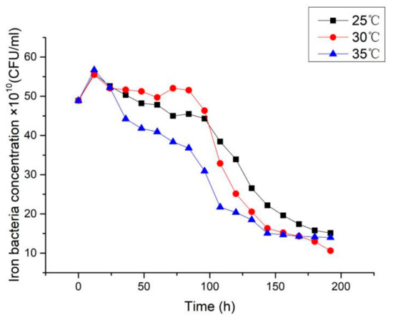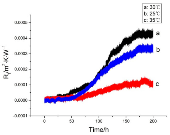 By maintaining other operating conditions, three groups of comparative experiments were performed by changing the temperature of the low temperature working fluid. The effect of the temperature on the biofouling characteristics of iron bacteria for three different temperatures is shown in Figure 7. As shown, the induction period existed in all the three experimental temperatures. When the temperature was 30 °C, the asymptotic value of the fouling resistance was the largest, while the induction period was the shortest. When the temperature was 35 °C, the asymptotic value of the fouling resistance was the smallest, while the induction period was the longest. When the temperature was 25 °C, the asymptotic value of the fouling resistance and the induction period were between the other two experiments. Figure 8 shows the variation of concentration of iron bacteria at different temperatures during the experiment. At 25 °C and 35 °C, the concentration of iron bacteria was almost always below that at 30 °C. With the increase in temperature, the Brownian motion was more intense, leading to an increase in the probability for iron bacteria to impact and adhere to the surface. Therefore, the time to reach the asymptotic value of fouling resistance was shortened at 35 °C. However, the activities of enzymes can also affect the reproduction and growth of bacteria [20]. At 30 °C, enzymes of the iron bacteria had more optimal activities than those at 25 °C and 35 °C. The iron bacteria with higher activity had a higher opportunity to adhere to the surface. Therefore, the induction period was the shortest and the asymptotic value of fouling resistance was the highest at 30 °C. In the initial stage of experiment, the number of iron bacteria at 30 °C was much more than those at 25 °C and 35 °C. But the iron bacteria reproduced and grew rapidly at 30 °C, and the coating corrosion was relatively serious. This led to increased exposed graphene and a fast consumption of the nutrients in the water. Hence, the concentration of iron bacteria declined rapidly after reaching a peak.