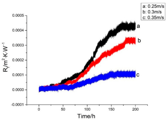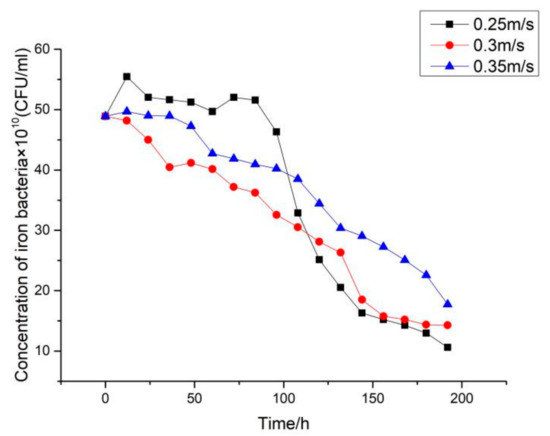 By keeping other operating conditions unchanged, three groups of comparative experiments were performed by changing the flow velocity of the low temperature working fluid. The effect on characteristics of iron bacteria biofouling due to three different flow velocities is shown in Figure 9. As shown in the figure, with the increase in flow velocity, the induction period increased and the asymptotic value of fouling resistance decreased. In the fouling deposition stage, the growth and detachment of biofilm are simultaneous [3]. The accelerated flow velocity increased the shear force of the fluid on the coating surface, and the higher shear force peeled more growth biofilm. Therefore, the induction period increased with the increase in flow velocity. Furthermore, as the flow velocity increased, the thinner biofilm attached to the surface, therefore, the solid content was lower [4], and the asymptotic value of the fouling resistance decreased. However, higher flow velocity provided more oxygen and nutrients, which led to the shortening of time to reach the asymptotic value of fouling resistance at 0.35 m/s. Figure 10 shows the variation of iron bacteria concentration at different flow velocities during the experiment. As shown in Figure 10, the concentration of iron bacteria kept decreasing at 0.3 m/s and 0.35 m/s, but raised first and then declined at 0.25 m/s. Though higher velocity provided more oxygen and nutrients, the iron bacteria came into contact with graphene more frequently. Therefore, at 0.25 m/s, the reproduced and decayed iron bacteria reached a dynamic balance at the initial stage of the experiment. At 0.3 m/s and 0.35 m/s, decayed iron bacteria were more than the reproduced iron bacteria.
