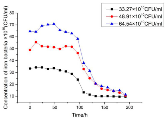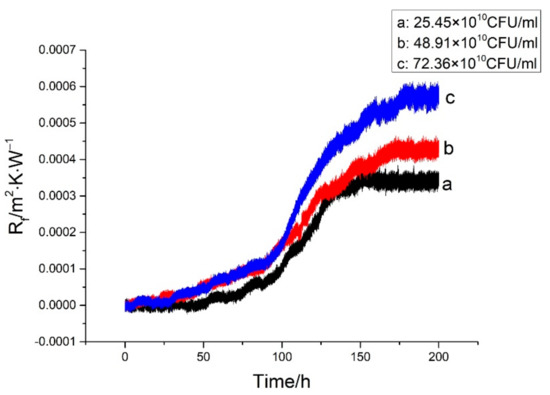 By keeping other operating conditions unchanged, three groups of comparative experiments were conducted by changing the concentration of iron bacteria in the low temperature working fluid. The effect on the characteristics of iron bacteria biofouling for three different concentrations is shown in Figure 11. As shown in the figure, with the increase in iron bacteria concentration, the induction period decreased, while the asymptotic value of fouling thermal resistance increased. The initial conditions for the formation of the biofouling is the formation and adhesion of the biofilm, and the formation of the biofilm is related to the absorption of protein molecules and organic polymer [21]. As the concentration of iron bacteria increased, more protein molecules and organic polymers were secreted and the biofilm was formed quickly. Therefore, the induction period and time to reach the asymptotic value of fouling resistance were shortened. Furthermore, the asymptotic value of fouling resistance was increased. Figure 12 shows the variation in the different concentrations of iron bacteria during the experiments. At high concentrations of iron bacteria, there was more dramatic decay of iron bacteria. The reason for the phenomenon is that the increase in iron bacteria concentration led to more iron bacteria reproduction. However, when the nutrients in the water were depleted, the iron bacteria decayed dramatically.